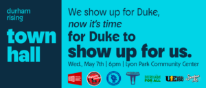 Join Duke Respect Durham for the Durham Rising Town Hall. May 7 • 6 PM at the Lyon Park Community Center (1309 Halley St, Durham). RSVP