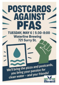 Join Cape Fear River Watch for a night of action on PFAS- postcard writing against current bills, and get important legislation across the finish line. May 6 • 5:30 – 8:00 PM. Waterline Brewing, 721 Surry Street, Wilmington