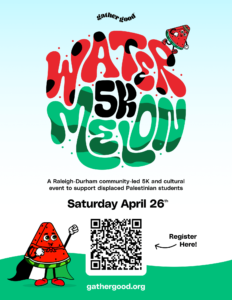Register for a 5K Walk/Run fundraiser A community led walk/run and cultural event supporting displaced Palestinian students. Saturday April 26. Race starts at 11 am, Kids run for free! Culture Fest starts at 12 pm. WakeMed Soccer Park, 101 Soccer Park Dr. Cary — Price increases Today April 8, at 4 pm