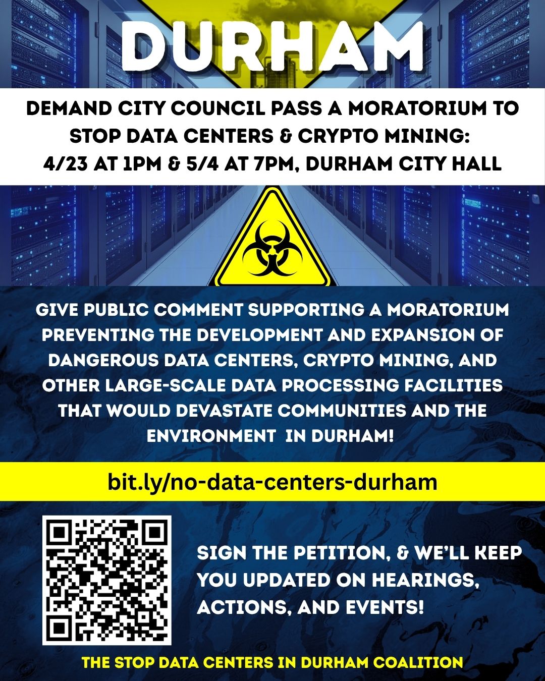 Demand the city of Durham pass a moratorium to stop data centers & cryptomining. Speak out on Thursday, April 23 • 1 PM, at Durham City Hall and sign the petition