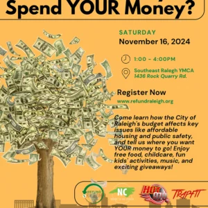 ![]() Ever wonder what the city does with your tax money? Refund Raleigh, in partnership with the NC Budget and Tax Center, Hot 97.9 and TrapFit Raleigh, invite you to the first ever "Show Me the Money" budget workshop on Saturday, November 16 from 1PM - 4PM at the Southeast Raleigh YMCA