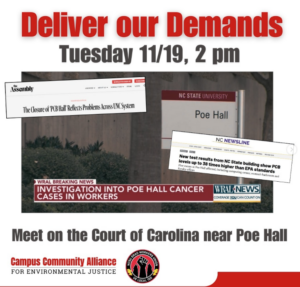 ![]() November 17 marks one year since the sudden closure of Poe Hall. As we reflect on this anniversary, we recognize that NC State University administration has not made sufficient progress and indeed have contributed to a climate of fear and mistrust about the safety of our campus. In the months after Poe’s closure, community members […]