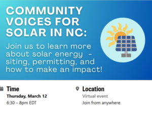 ![]() Join us for a beginner-friendly introduction to solar energy development in North Carolina for community organizations, environmental advocates, and concerned residents. This is the first session in a three-part webinar series exploring solar energy and community engagement. This event will be Thursday, March 12 from 6:30 to 8:30 pm. |