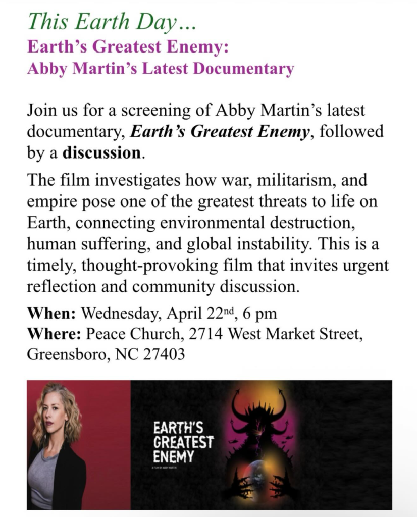 A public showing of the film Earth's Greatest Enemy This event will be on April 22nd at 6:00 pm.