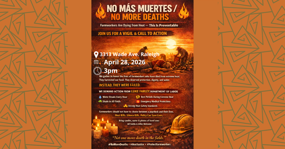 As you all know we have been fighting for water, breaks, right to medical attention and an emergency plan in the fields of North Carolina for a while. Luke Farley our Labor Commissioner has ignored our requests and suggestions for improving worker protections, not only that but he has created a majority corporate advisory council on Heat. This means he is looking more to protect corporate interests than workers’ lives. This is why we are asking all denomination churches from now until Nov. 1st (Day of the Dead/Spirits) to hold vigils all over the state and pray not only for those workers who have died and their loved one’s but those in power who are refusing to address the issue in a series manner. All worker lives and safety should be set as a priority before elevator fotos, voluntary compliance, credits for citations to employers and informal conferences.